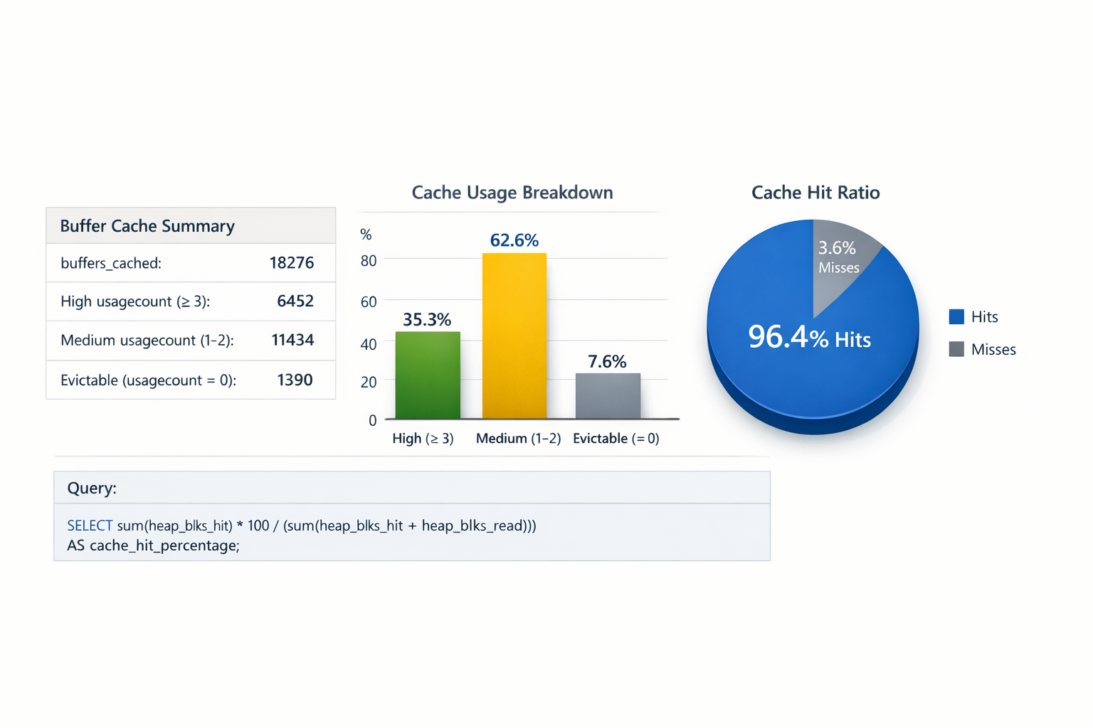 - Analyze usage count distribution: A healthy number of buffers with higher usage counts indicates hot data benefiting from cache reuse.