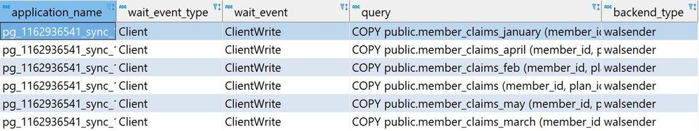 SELECT application_name, wait_event_type, wait_event, query, backend_type FROM pg_stat_activity WHERE state='active';