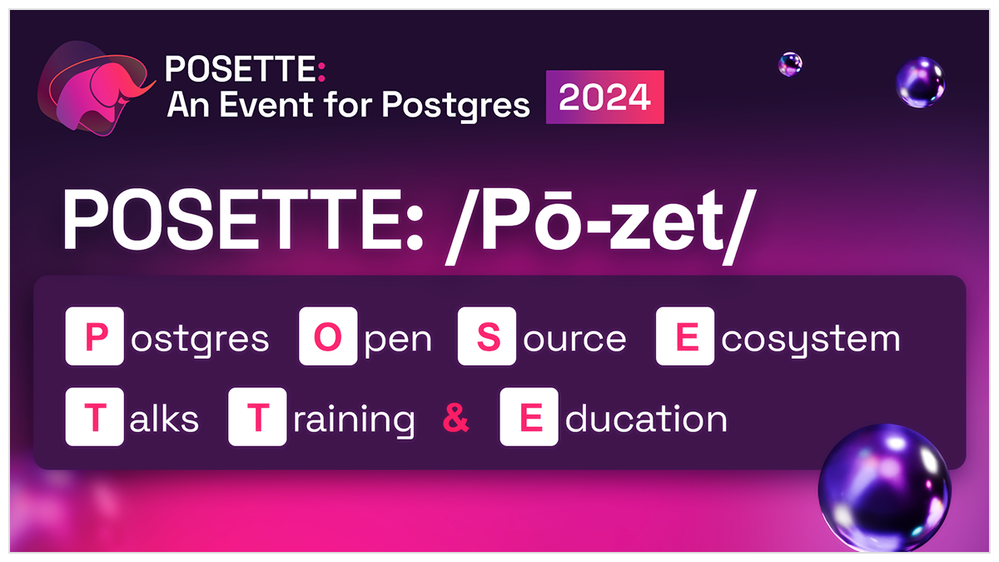 POSETTE is pronounced /Pō-zet/ and stands for Postgres Open Source Ecosystem Talks Training & Education.