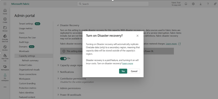 Organizations can enable BCDR through the Admin portal under Capacity settings:
