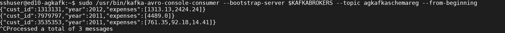 sudo /usr/bin/kafka-avro-console-consumer --bootstrap-server $KAFKABROKERS --topic agkafkaschemareg --from-beginning