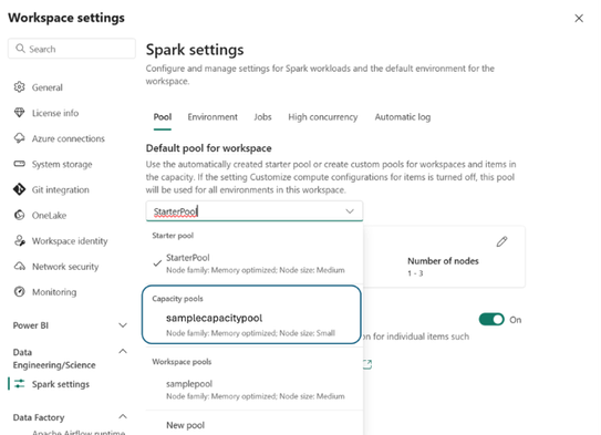 - Custom Pools: size nodes, enable autoscale, dynamic executors. Create via workspace Spark Settings (requires capacity admin to enable workspace customization).