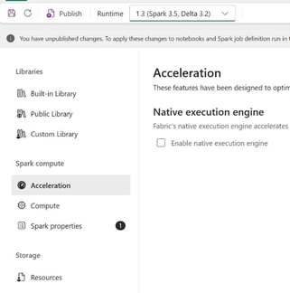 - Use Fabric Runtime 1.3 (Spark 3.5, Delta 3.2) and enable the Native Execution Engine to boost performance; enable at the environment level under Spark compute → Acceleration.