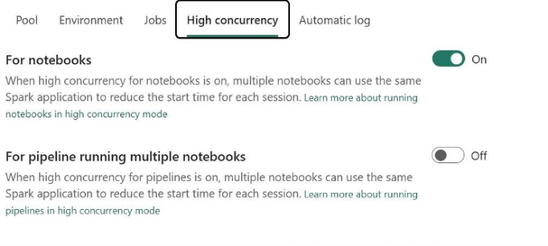 - Enable High Concurrency to share Spark Sessions across notebooks (and pipelines) to reduce session startup latency and cost; use session tags in pipelines to group notebooks.