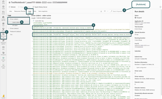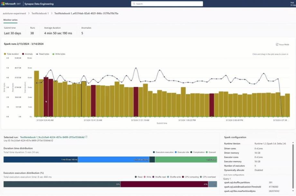 - Inspect the Run Duration chart; click on a run to see read/write bytes, idle time, core allocation, overall utilization, and other Spark metrics.