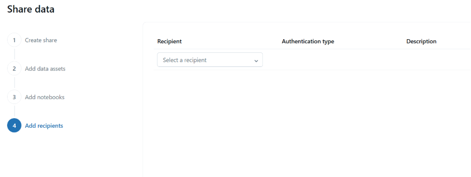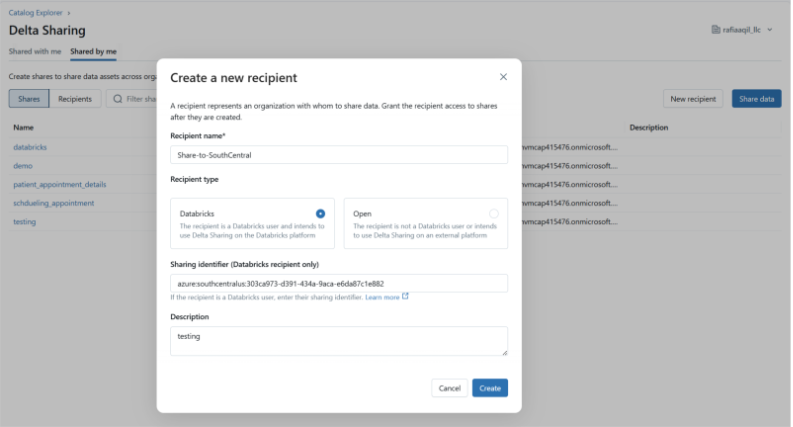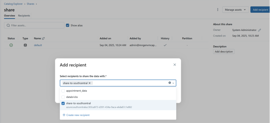 - From the newly created share, click Add Recipient. Select your South-Central Workspace Metastore ID.