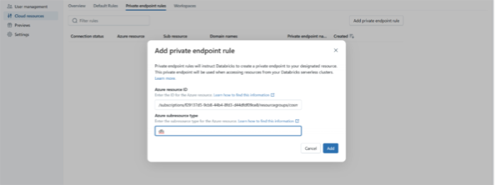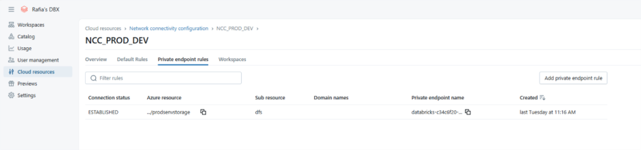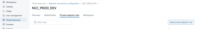 - In Cloud resources, select your NCC, select Private Endpoint Rules and click Add Private Endpoint Rule.