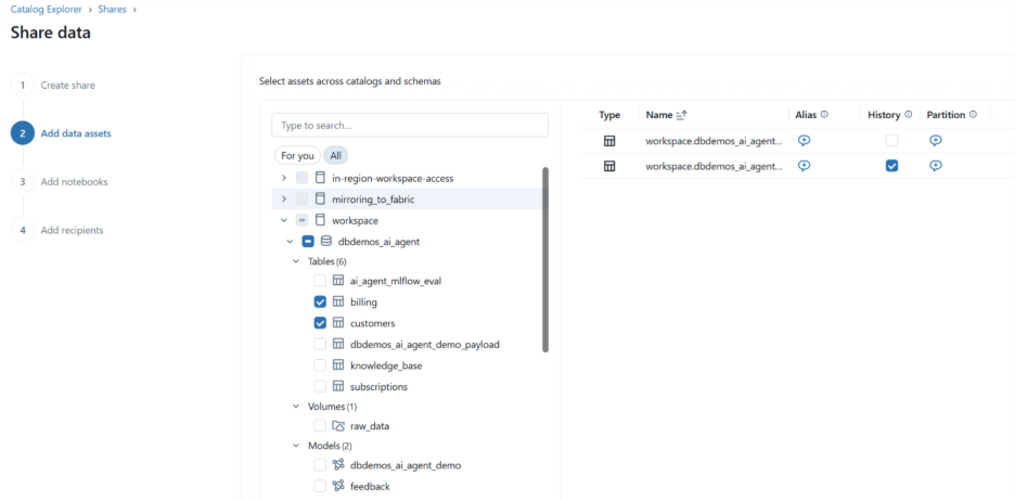 Note: Please disable History for the selected data assets, as the current data snapshot. Disabling the History option on the Delta Share will simplify the share and prevent unnecessary access to historical versions. Additionally, review whether you can further simplify your share by partitioning the data where appropriate.