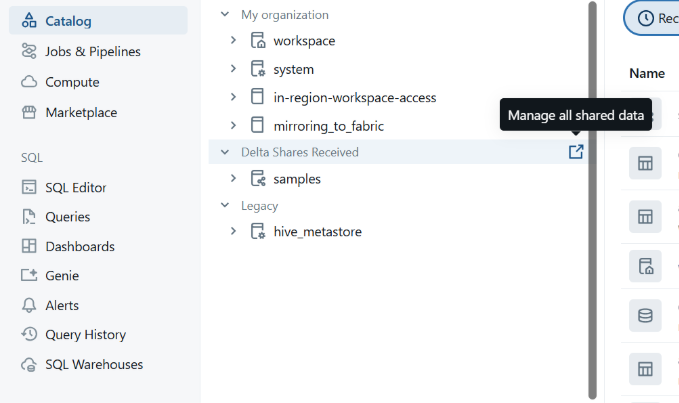 - When the icon appears, click it. → This will redirect you to the Delta Sharing page.