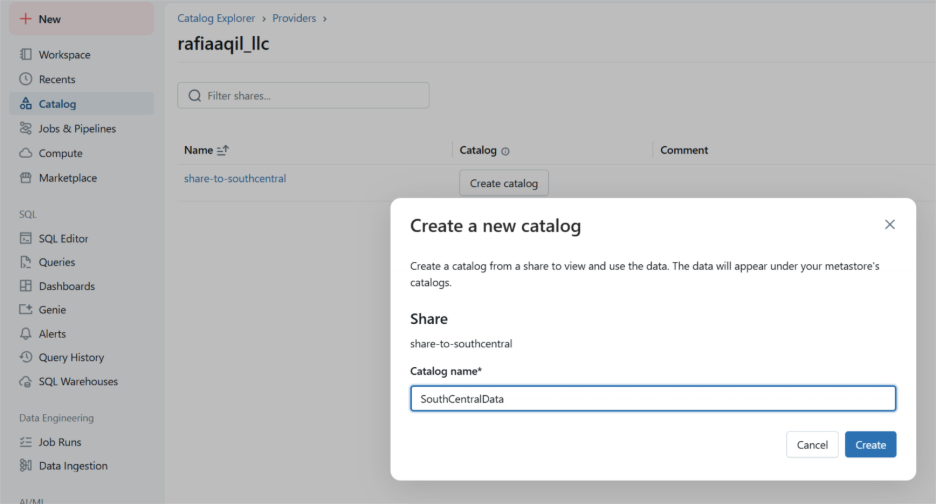 Note: If you cannot view your share, run the following SQL command: GRANT USE_PROVIDER ON METASTORE TO `username@xxxx.com`.