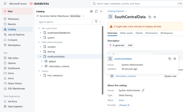 This guide walks you through the steps to share Delta tables between two Databricks workspaces (NorthCentral and SouthCentral) and configure Network Connectivity Configuration (NCC) for a Serverless Warehouse. These steps ensure secure data sharing and connectivity for your workloads.