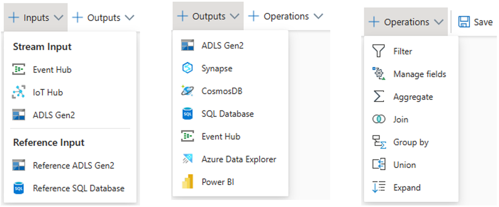 - Add at least one input, one output, and optionally, an operator (depending on whether you need to process your streaming data) from the ribbon.