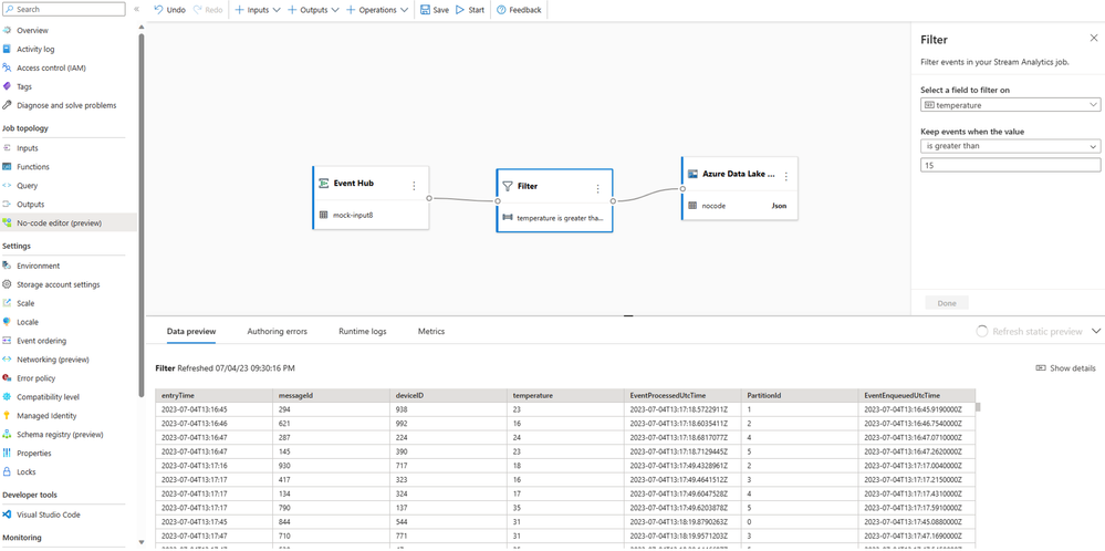 To learn more about the no-code editor, see No-code stream processing in Azure Stream Analytics | Microsoft Learn.