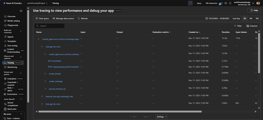 The Tracing tab shows the full distributed trace of each agent request, including all spans emitted by Microsoft Foundry and your Azure Container App with Microsoft Agent Framework. You can see: