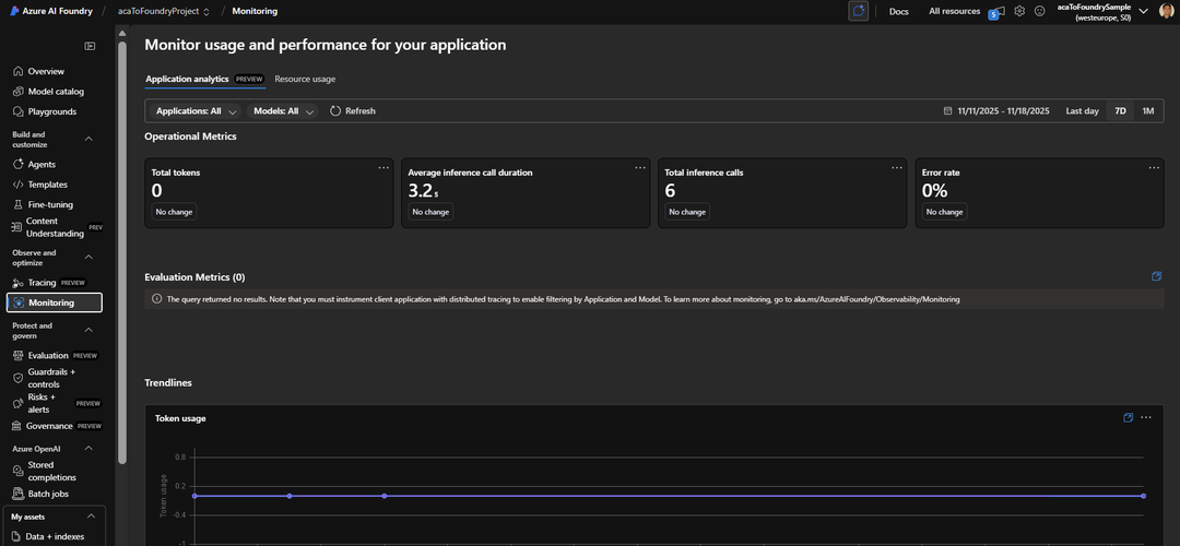Once your Application Insights connection is added, you can view your agent’s telemetry directly in Microsoft Foundry’s Monitoring experience.