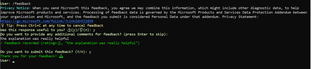 Provide in-line feedback: Share insights directly from the CLI about the agent's performance using /feedback. Provide a rating of the agent's analysis and optional written feedback directly to the agentic CLI team. Your feedback is highly appreciated and will help us improve the agentic CLI's capabilities.