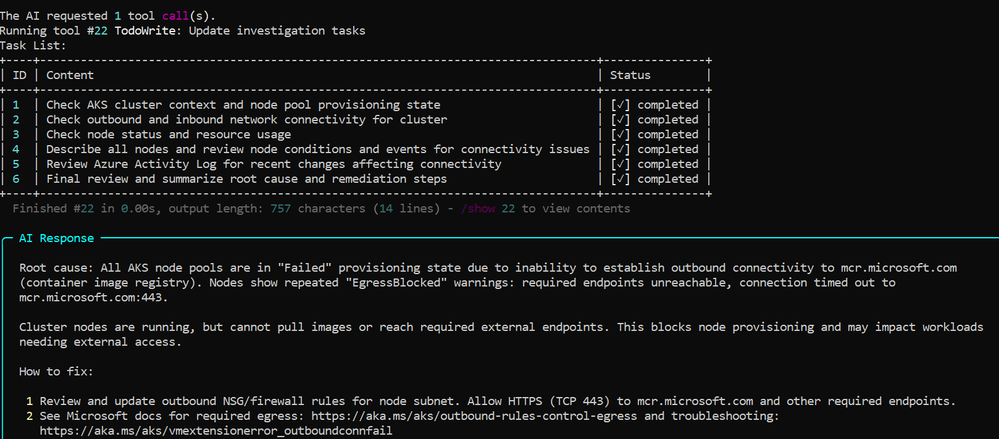 Try it out: az aks agent “list all my unhealthy nodepools” --aks-mcp -n <cluster-name> -g <resource-group>