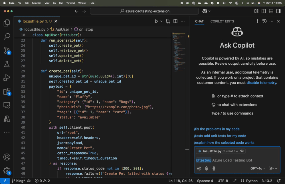 There's a better way than writing load test scripts by hand. The new Azure Load Testing extension for Visual Studio Code (Preview), now integrated with GitHub Copilot, automatically generates realistic, Locust-based load tests. It seamlessly handles authentication, API request sequencing, response validation, and test data—helping you save time and ensure realistic performance testing.