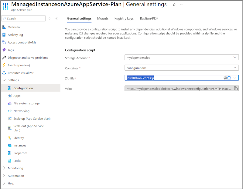 -          Configuration scripts – Provide a zip file containing all your dependencies with an accompanying PowerShell script to install and configure your dependencies.  Store this in Azure Storage and securely access and retrieve using Managed Identity.