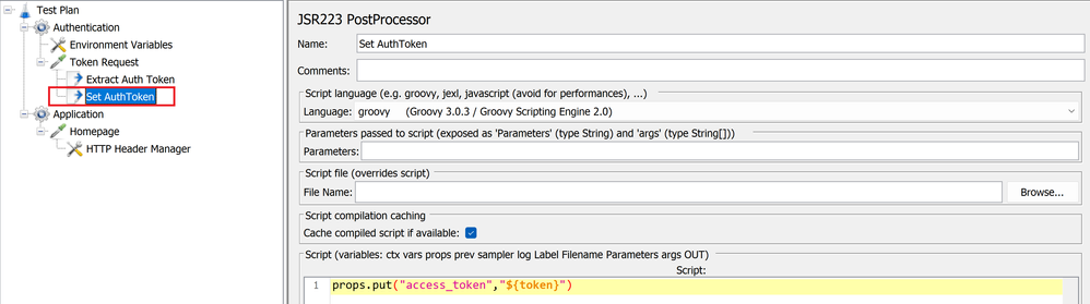 - The next post processor element would be JSR223(Set AuthToken), which will be used to set the token extracted as a property named access_token. Setting it as a property will allow the variable to be accessible globally across samplers and hence can be accessed by the next thread group.Setting property as an access token property
