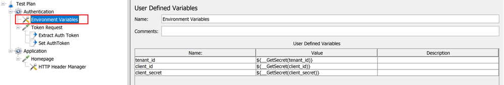 - Add an environment variable element to the Authentication thread group. This environment variable will be used to fetch the values of fields like client_id, client_secret and tenant_id which we stored earlier in the key vault at runtime to help acquire the access token.Defining used defined variable