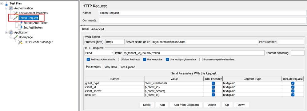 - Add a child HTTP request sampler (Token Request) to the Authentication thread group. Within this HTTP request we will setup a post method that will help retrieve the access token.Defining the POST method to get access token