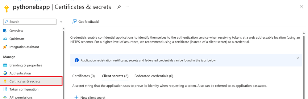 - Retrieve the client_secret for the app by clicking on Certificate & secrets >> Client Secrets