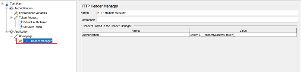- Next, let’s configure the application landing page (Homepage) to access the application homepage. Add a child element a header manager, to configure and maintain the header to be passed with the request. In this case we only pass the authorization header that would contain the bearer token obtained from the previous thread group (Authentication).Configuring the header manager