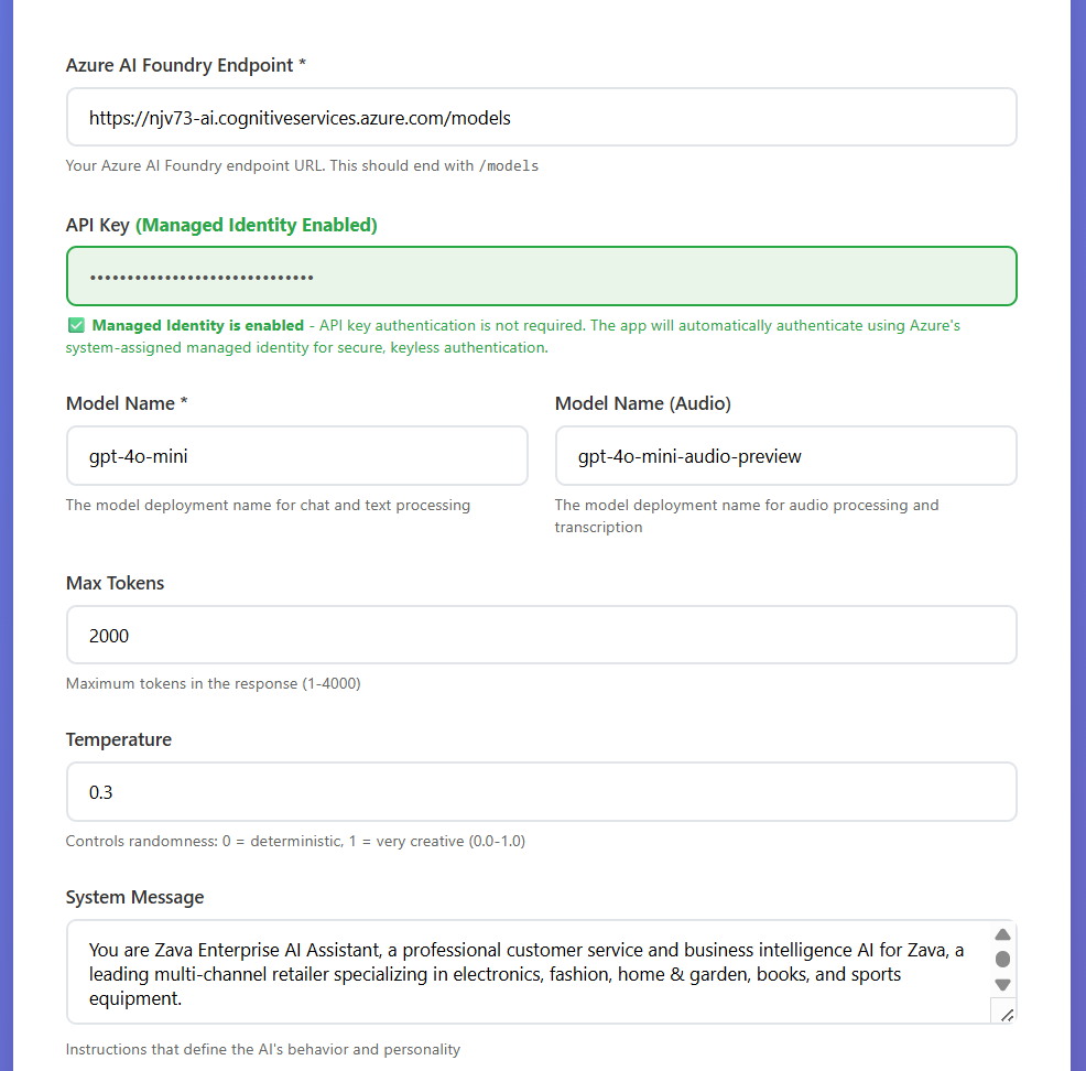 - Secure Configuration: Managed Identity authentication with Azure AI Foundry (no API keys required)
