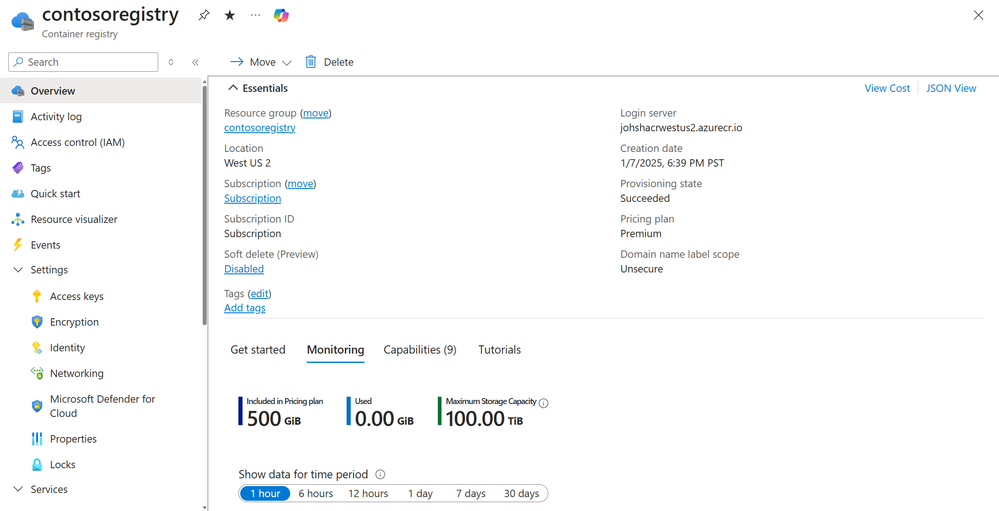 We're also introducing an updated Portal experience for storage capacity visibility—a long-standing customer request. You can now monitor your storage consumption directly from the Monitoring tab in the Azure Portal Overview blade, making it easier to track usage against your registry limits.