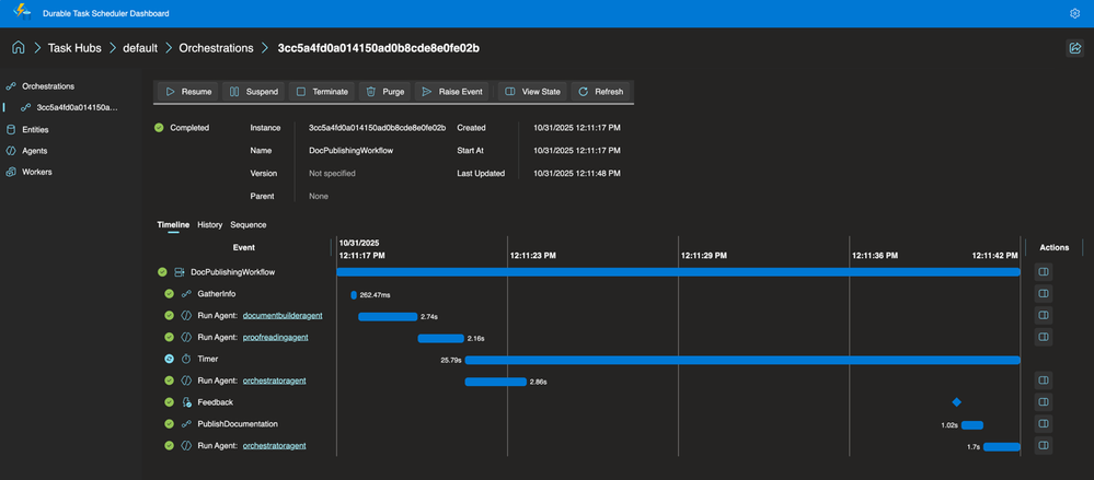 • Built-in Observability with Durable Task Scheduler: Deep visibility into agent operations and orchestrations through the Durable Task Scheduler UI dashboard