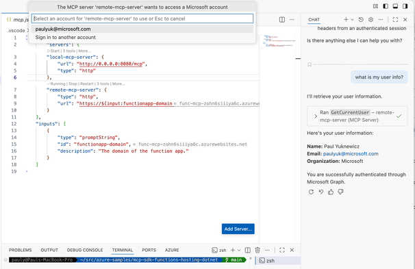 The built-in authentication and authorization feature can now be used for MCP server authorization, using a new preview option. You can quickly define identity-based access control for your MCP servers with Microsoft Entra ID or other OpenID Connect providers. Learn more at https://aka.ms/functions-mcp-server-authorization.