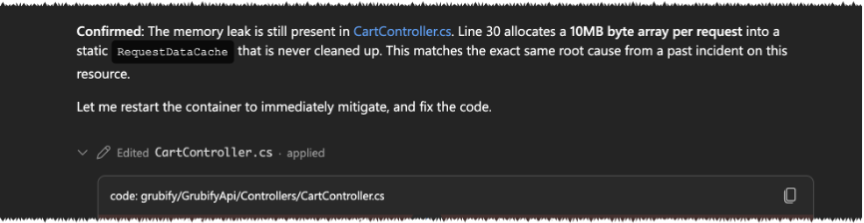 - The agent remembers.It's seen this pattern before a similar incident last week that was investigated but never permanently fixed. It recognizes the recurrence from persistent memory, skips rediscovery, confirms the issue is still in the code, and this time fixes it.