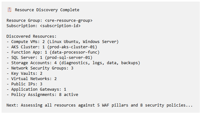 The agent automatically discovers all resources in the target resource group, including VMs, storage accounts, NSGs, Key Vaults, App Services, and more - no manual resource IDs needed.
