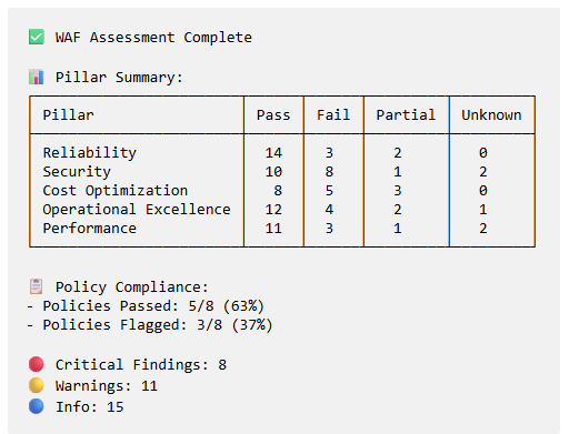 Multi-Pillar WAF Assessment - For each discovered resource, the agent validates against all 5 WAF pillars (Reliability, Security, Cost Optimization, Operational Excellence, Performance) using Azure MCP tools, generating an assessment summary with pass/fail/partial/unknown counts.