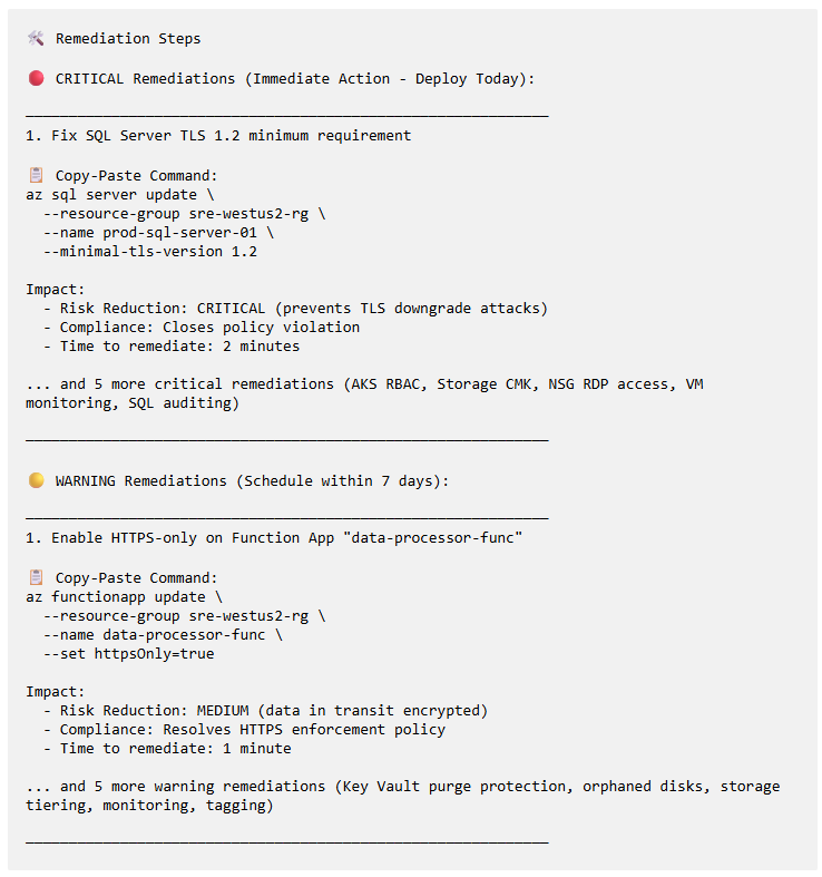 Automated Remediation Codegen - For every finding, the agent generates exact Azure CLI commands, Terraform snippets, and Portal steps with impact quantification (risk reduction, cost savings, compliance improvement).