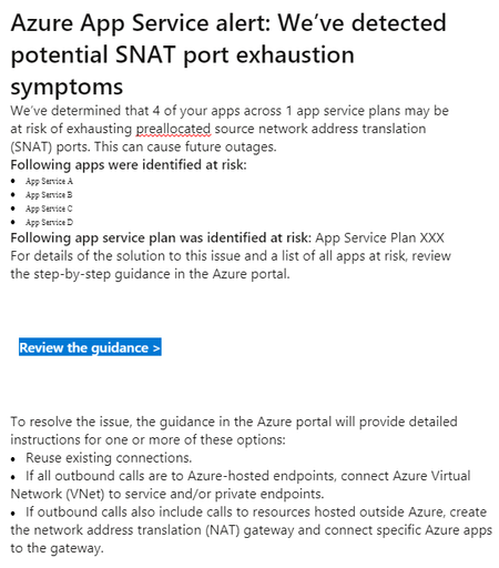 Recently Azure App Service users might receive email alert on potential SNAT Port Exhaustion risk of services. Here is a sample email.