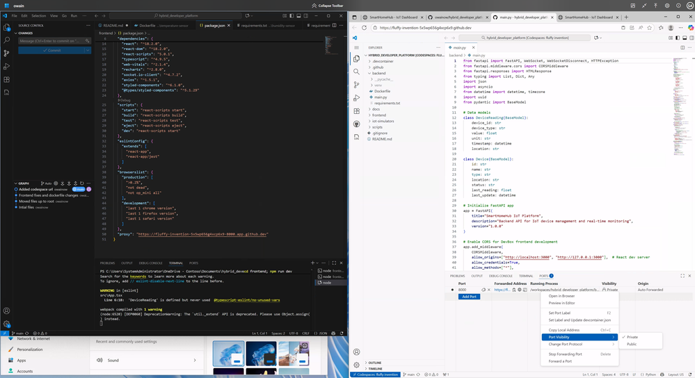 I toggle between Dev Box and Codespaces to test and validate the integration. I do this in my Dev Box Edge browser viewing my codespace (I use my Codespace in a browser through this demo to highlight the difference in environments. In reality I would leverage the VSCode "Remote Explorer" extension and its GitHub Codespace integration to use my Codespace from within my own desktop VSCode but that is personal preference) and I use the same browser to view my frontend preview. I update the environment variable for my frontend that is running locally in my Dev Box and point it at the port running my API locally on my Codespace. In this case it was a web socket connection and HTTPS calls to port 8000. I can make this public by changing the port visibility in my Codespace.