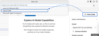 To bridge that gap, the latest release introduces project scaffolding. Once you’ve explored model responses in Model Playground, click View Code. You’ll now see a new option: