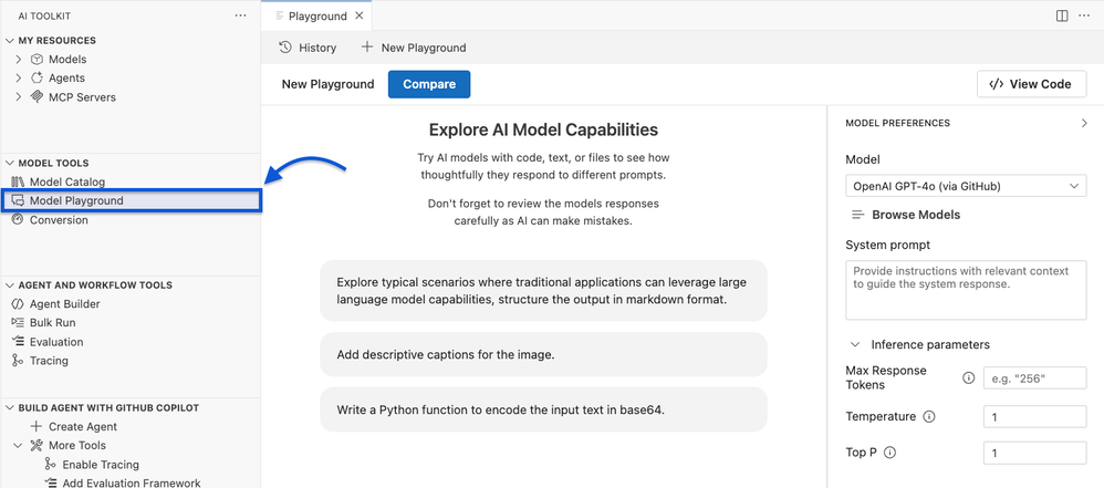 AI Toolkit VS Code extension is a great place for developers to experiment, prototype, and learn about AI workflows. Developers exploring AI often start in "Model Playground" — experimenting with models, testing prompts, and iterating on ideas. But turning those experiments into real applications can take time.