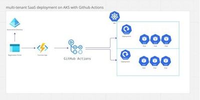 Here is the proposed architecture to deploy a multi-tenant SaaS infrastructure on AKS automated with Github Actions. An Azure Function gets the tenant context after registration and with that, can trigger a GitHub Actions workflow by making a call to GitHub's REST API. The REST API call can be made using the HTTP trigger of an Azure Function, which will then run the GitHub Action jobs that will push tenant specific configuration to AKS and launch application pods.