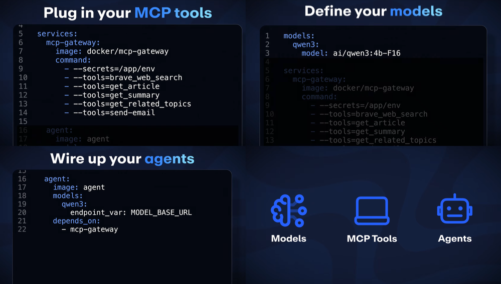• Run anywhere with the same configuration. Docker emphasizes that you can define your open models, agents and MCPcompatible tools, then spin up your full agentic stack with a simple docker compose up. By bringing this workflow to ACA, Microsoft ensures that the same compose file runs unchanged on your laptop and in the cloud.