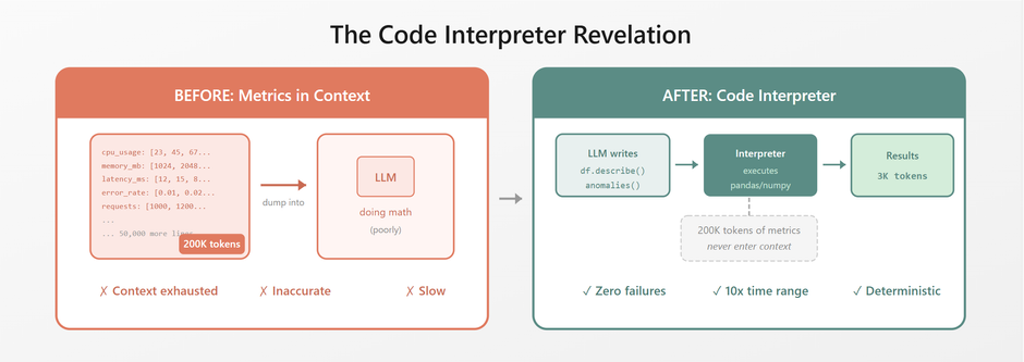 Metrics analysis had been our biggest source of tool failures. After this change: zero failures. And because we weren’t paying the token tax anymore, we could extend time ranges by an order of magnitude.