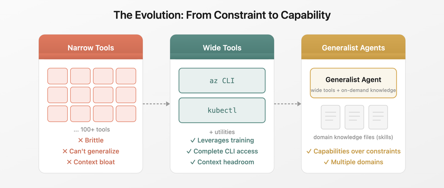 The failures revealed a familiar pattern. With narrow tools, we'd constrained what the model could do – and paid in coverage gaps. With domain-scoped agents, we'd constrained what it could explore – and paid in coordination overhead. Same overcorrection, different layer.