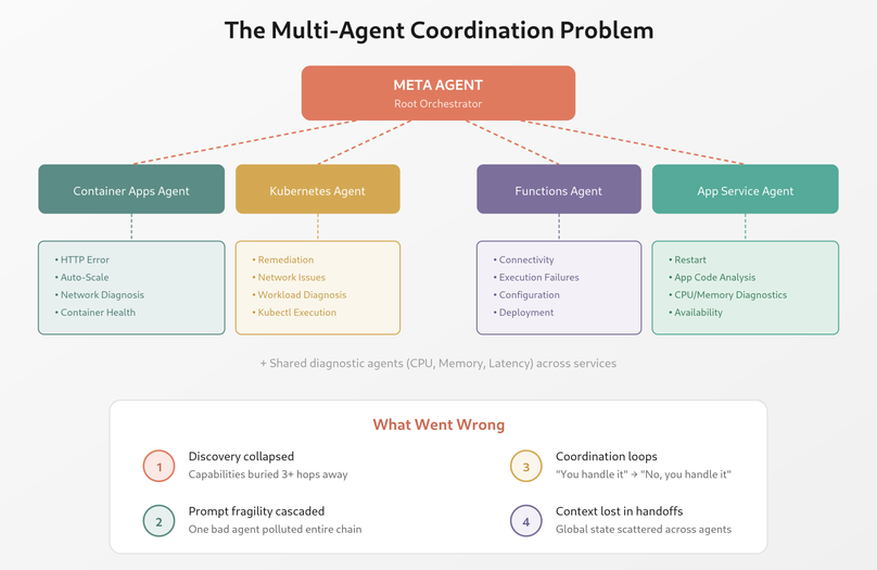 Human experts have overlapping domains - a Kubernetes engineer knows enough networking to suspect a route issue, enough about storage to rule it out. This overlap makes human handoffs intelligent. Our agents had hard boundaries. They either surrendered prematurely or developed tunnel vision, chasing symptoms in their domain while the root cause sat elsewhere.