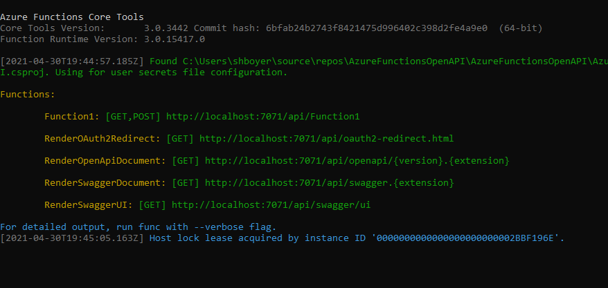 The new function is bootstrapped with the necessary implementation for OpenAPI support. When running the application, notice not only does the function emit the “Function1” endpoint as expected but also additional routes for a dynamic endpoint for OpenAPI document, Swagger document in JSON or YAML, Authentication redirects and the Swagger UI interactive app.