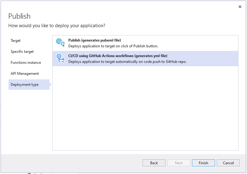 On finishing the publish dialog, a GitHub Action is created and committed to the repository triggered by a push of any change.