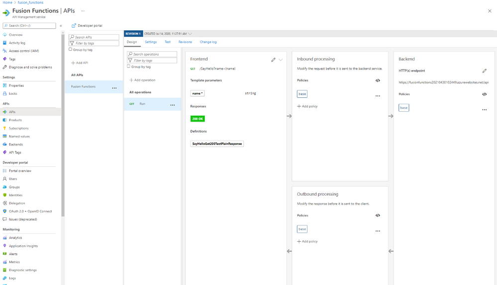 Using either method publishes or updates your Azure Function, creates or updates the API Management instance AND imports the function for you.