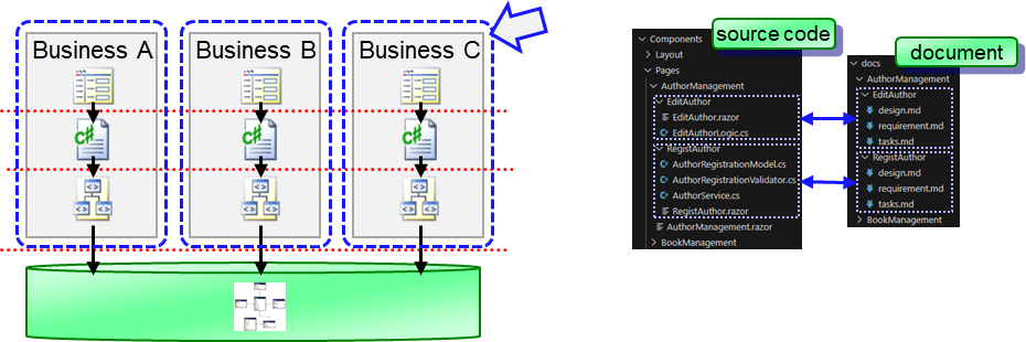 In this case, the foundational parts (the database layer) should not be modified arbitrarily by individual developers. Instead, focus on how to standardize the development of the individual application parts (the blue-framed sections) while ensuring consistency. Architecture documentation should be organized with this distinction in mind, emphasizing the uniformity of application-level development built upon the stable foundation.