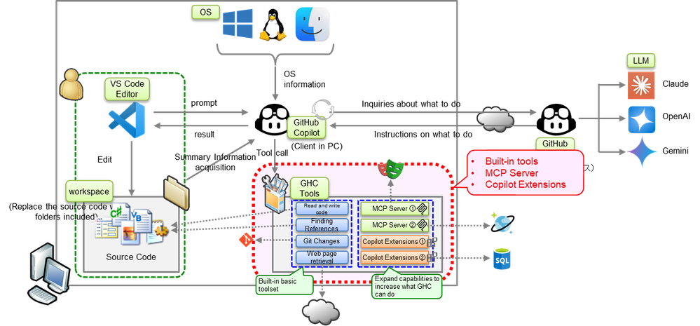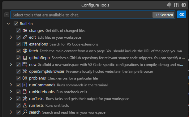 You can specify not only the MCP server functionality but also built-in tools and Copilot Extensions.